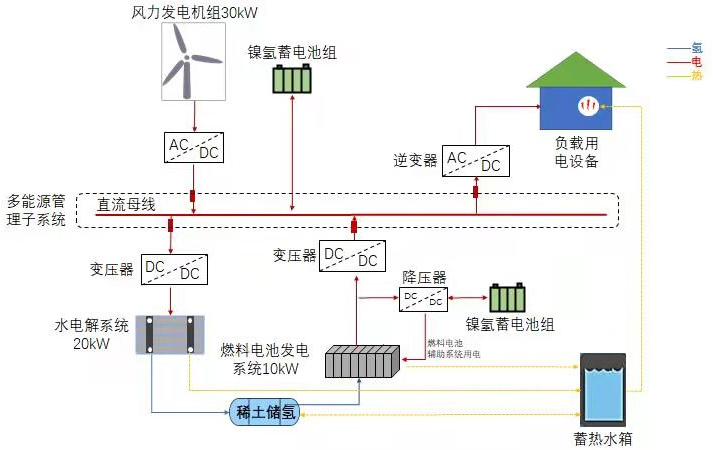 在光伏電和風(fēng)電資源豐富地區(qū),以光伏、風(fēng)電為等可再生能源制氫儲能結(jié)合氫燃料電池發(fā)電技術(shù),實現(xiàn)無光/無風(fēng)條件連續(xù)、穩(wěn)定的電力供應(yīng),形成完全依賴清潔可再生能源、氫儲能系統(tǒng)的電力保障,實現(xiàn)零碳?xì)淠芫C合利用的解決方案。